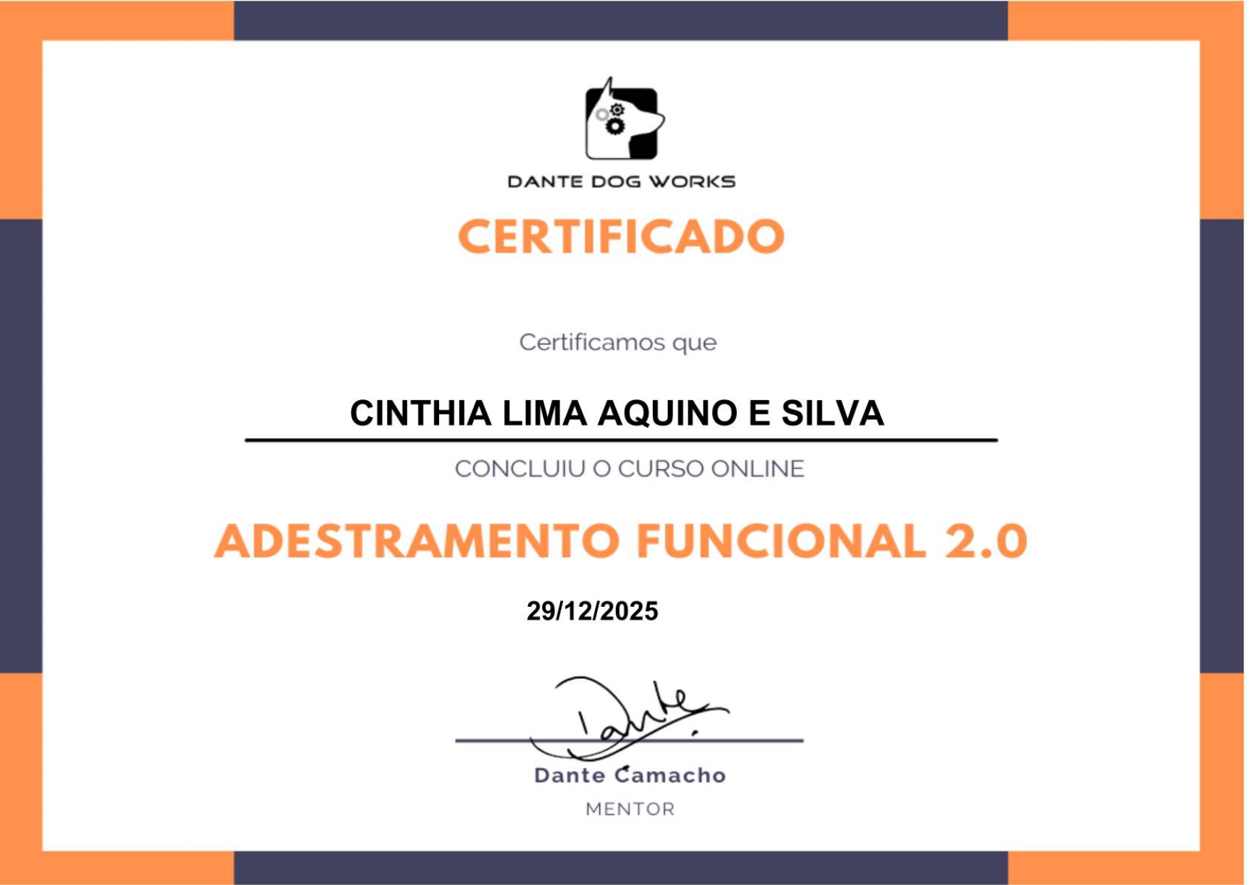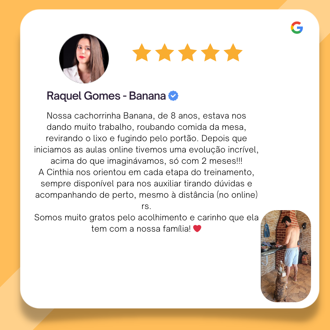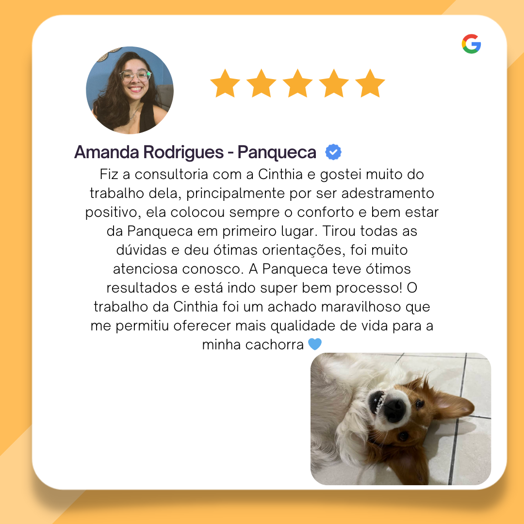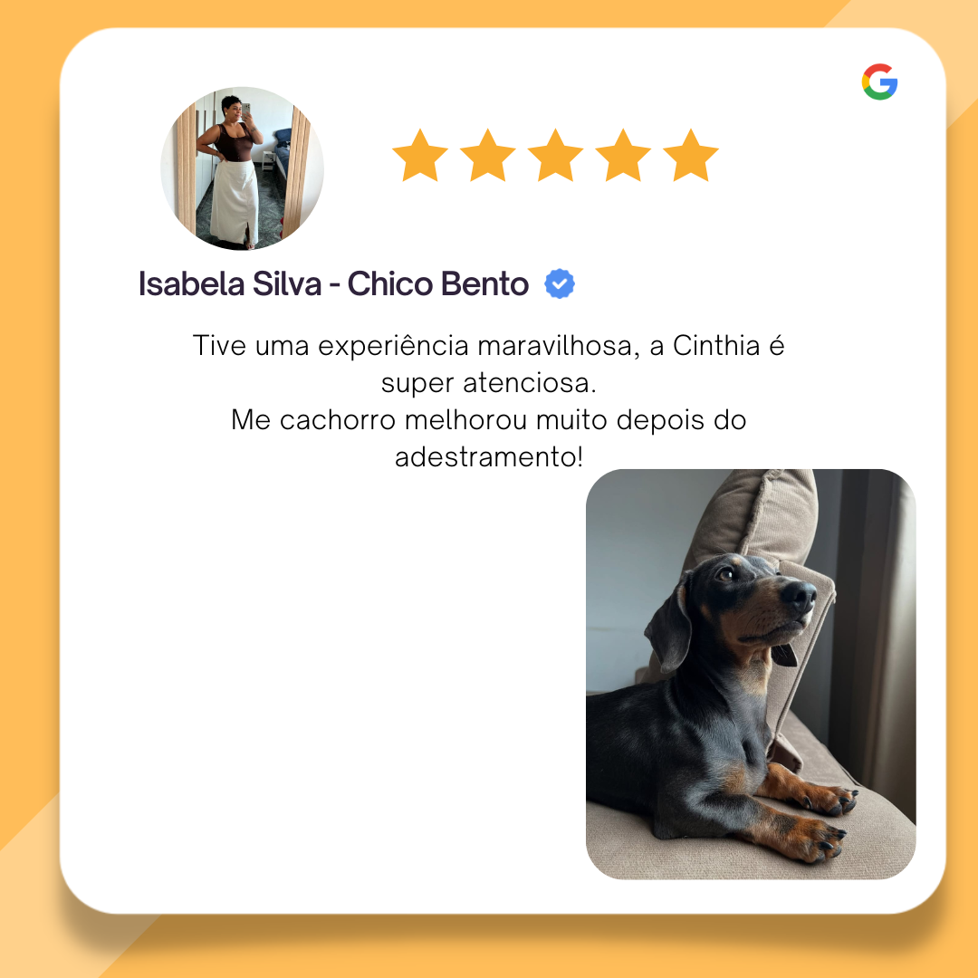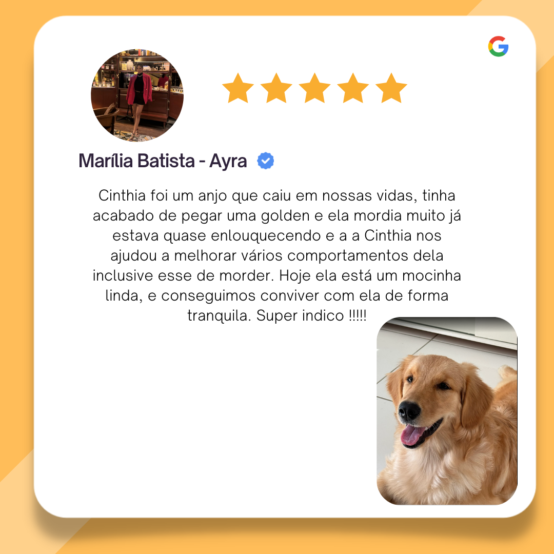 Cinthia foi um anjo que caiu em nossas vidas, tinha acabado de pegar uma golden e ela mordia muito já estava quase enlouquecendo e a a Cinthia nos ajudou a melhorar vários comportamentos dela inclusive esse de morder. Hoje ela está um mocinha linda, e conseguimos conviver com ela de forma tranquila. Super indico !!!!!