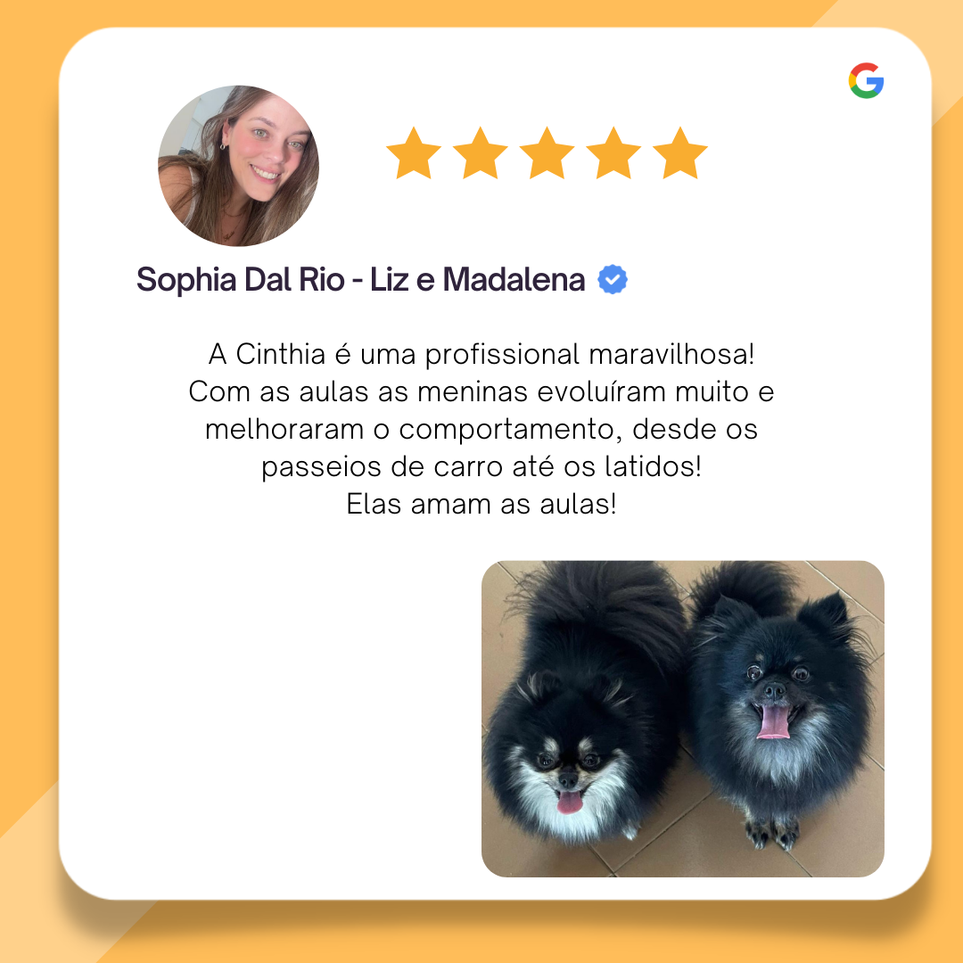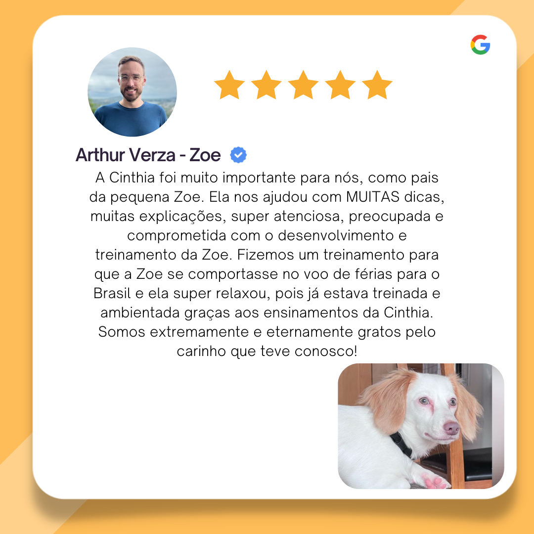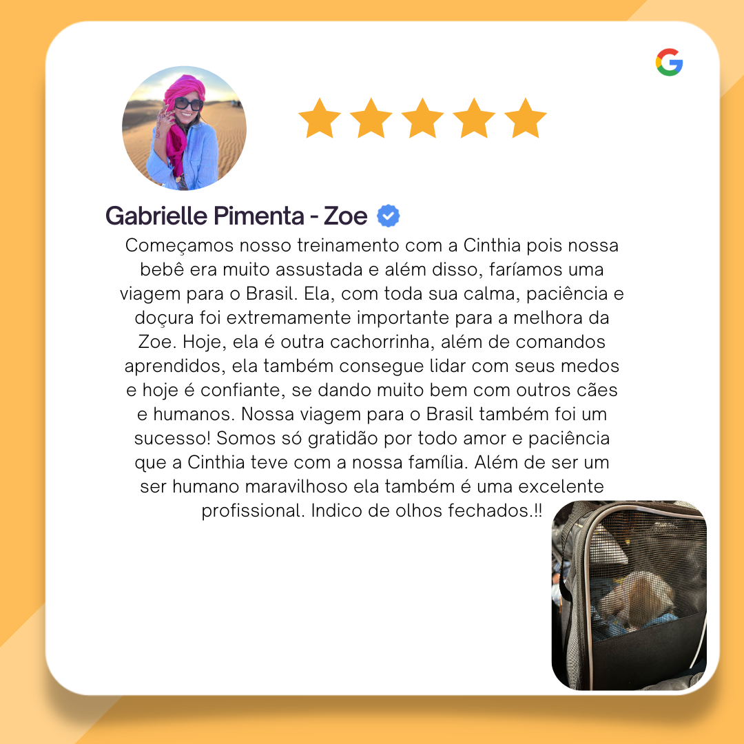 Começamos nosso treinamento com a Cinthia pois nossa bebe era muito assustada e alem disso, faríamos uma viagem para o Brasil. Ela, com toda sua calma, paciência e doçura foi extremamente importante para a melhora da Zoe. Hoje, ela é outra cachorrinha, alem de comandos aprendidos, ela também consegue lidar com seus medos e hoje é confiante, se dando muito bem com outros cães e humanos. Nossa viagem para o Brasil também foi um sucesso! Somos só gratidão por toda amor e paciência que a Cinthia teve com a nossa família. Alem de ser um ser humano maravilhoso ela também é uma excelente profissional. Indico de olhos fechados.!!