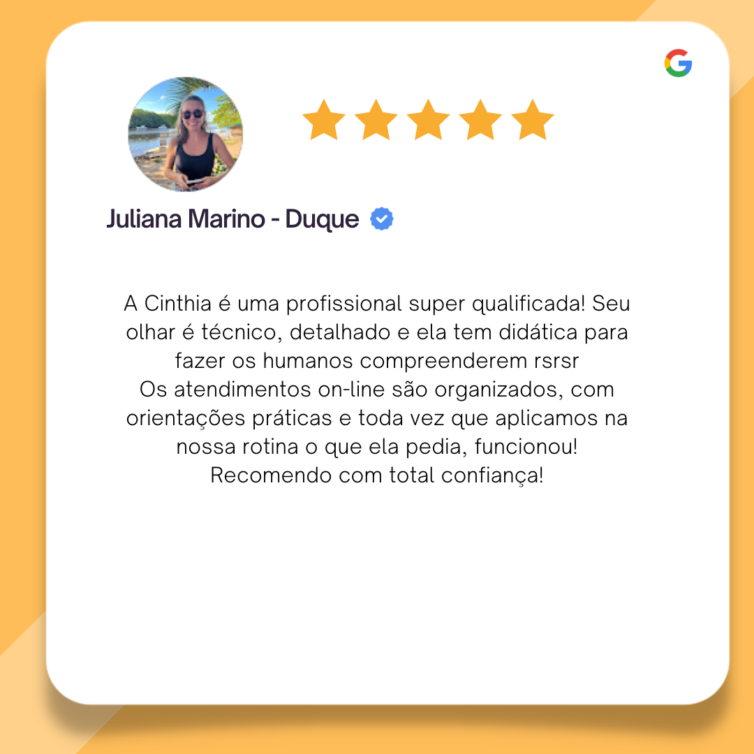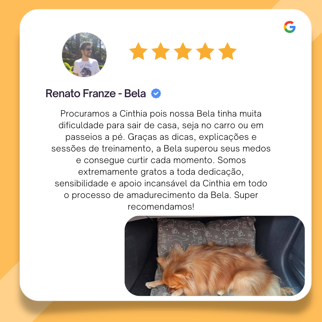 Procuramos a Cinthia pois nossa Bela tinha muita dificuldade para sair de casa, seja no carro ou em passeios a pé. Graças as dicas, explicações e sessões de treinamento, a Bela superou seus medos e consegue curtir cada momento. Somos extremamente gratos a toda dedicação, sensibilidade e apoio incansável da Cinthia em todo o processo de amadurecimento da Bela. Super recomendamos!